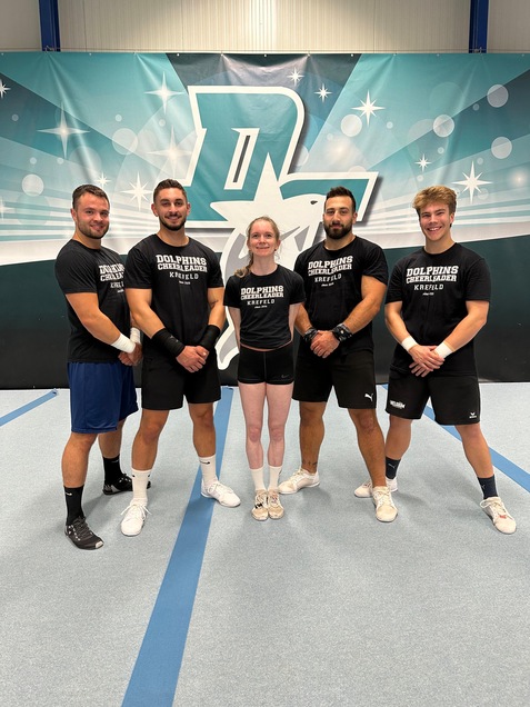 Als besonderes Highlight wagten sich dann die Dolphins Coed Athleten Leon Mogharbel, Felix Keßner, Tom Franz, Aron de Coster als Bases und Laura Hutschemaekers als Flyer an den Versuch, den aktuellen Weltrekord im Cheerleading "höchster Basket Toss" zu überbieten.