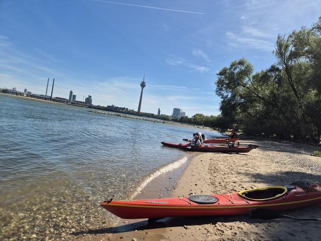 Auch bei der Paddeltour meinte es der Wettergott gut mit uns, viel Sonnenschein und ganz überwiegend Rückenwind. So konnten wir - trotz der Feier in den Knochen - das Paddeln genießen. Eine Pause eingelegt haben wir am Paradiesstrand in Düsseldorf, der jetzt auch etwas nüchterner als Rheinstrand bezeichnet wird, um keine potentiellen Badegäste anzulocken, Stichwort: Badeverbot.