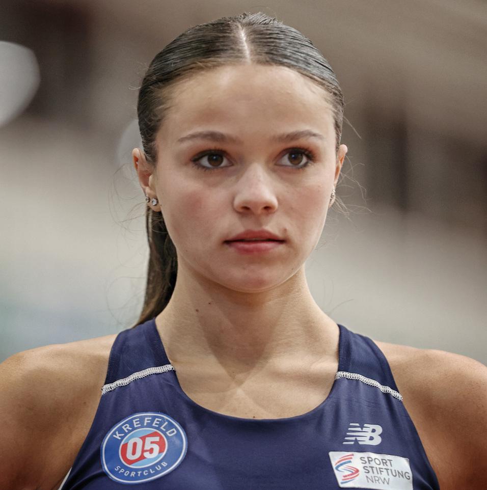 Erfolgreichste Teilnehmerin war dabei Imke Martini (Foto), die in der U18 mit starken 25,48 s die 200 Meter Konkurrenz gewann und dazu noch Silber holte mit der U20 Staffel über 4 x 200 m in 1:43,36 min (Martini – Carlotta Neuenhahn – Lina Juchems – Lisa Mauel). Beide Leistungen bedeuten Normerfüllung, so dass einem Start in drei Wochen in Sindelfingen bei den Deutschen U20 Hallenmeisterschaften nichts im Wege steht. Gleiches gilt für Ina Gödicke, die ihre Bestzeit über 60 m Hürden um über eine Zehntel auf nunmehr 8,54 s steigerte und damit souverän die U20-Konkurrenz gewann. Mit dieser Zeit kann sich die 18-Jährige berechtigte Hoffnungen auf eine Endlaufteilnahme in Sindelfingen machen. Die dritte Goldmedaille ging auf das Konto von Dreispringerin Alyssa Tagbo mit 13,31 m im Dreisprung der Frauen. „Ich bin mega zufrieden“ sagte die 22-Jährige nach dem Wettkampf. “Endlich gab es den erhofften Leistungssprung“. Mit ihrer Siegesweite schob sich die Essenerin aktuell auf Platz vier in der Deutschen Hallenbestenliste im Dreisprung der Frauen und kann guter Dinge auf die in vier Wochen stattfindenden nationalen Titelkämpfe in Dortmund blicken.