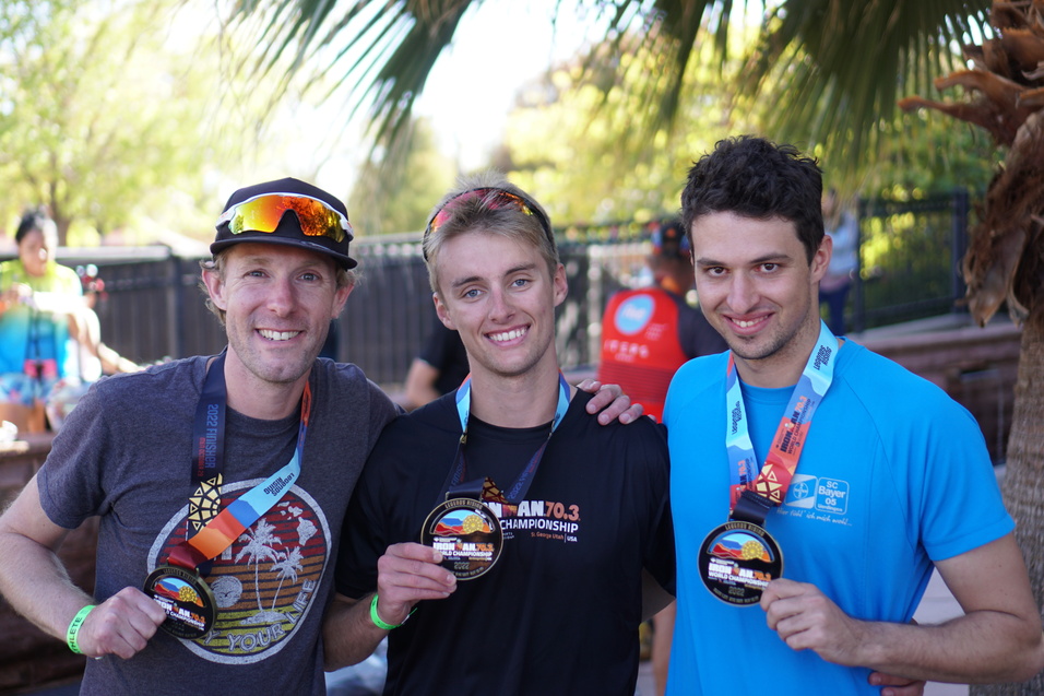 In der Wechselzone war ich so voller Adrenalin, dass ich kurzerhand alle Pläne über Bord warf und mir nur meine Socken anzog. Geplant waren eigentlich Handschuhe und Ärmlinge, aber im Rennen fühlt sich das Wetter dann doch nur noch halb so schlimm an. Da wir als vorletzte Altersgruppe gestartet sind, war die Radstrecke bereits entsprechend voll. Für mich hieß es dann: Blinker links und so weit es geht nach vorne. Ich hatte überhaupt keine Ahnung wo ich im Rennen lag, mein erster Ansporn war zu dem Zeitpunkt: irgendwie auf Moritz auffahren, der ja knappe zehn Minuten vor mir gestartet war. Ich stellte relativ schnell fest, dass das hier genau mein Ding war. Ich hatte die Beine meines Lebens und konnte mein Gewicht auf dem sehr hügeligen Kurs perfekt ausspielen. Nach knapp 30 km hatte ich Moritz eingefangen, nach 35 km bin ich das erste Mal an unseren mitgereisten Fans vorbei gefahren. Ich war voll in meinem Element, mit einem breiten Grinsen bin ich gefühlt über den Kurs geflogen. Erst im Snow Canyon, der Schlussanstieg der Radstrecke, musste ich das erste Mal wirklich beißen und mir wurde bewusst, dass ich bereits 1000 hm in den Beinen hatte, aber auch auf einem Kurs von unter 2:15 Std für den Radsplit war. Das war Ansporn genug, vielleicht etwas zu viel Ansporn, aber dazu später mehr. Nach ziemlich genau 2:15 Std. fuhr ich die Diagonal Street nach St. George runter und was mich da erwartete, ließ mich nur noch breiter grinsen. Zuschauermassen in mehreren Reihen, die komplette Laufstrecke entlang, es war der Wahnsinn. Gefühlt war ganz St. George zum Anfeuern gekommen, selbst auf dem Rad war man fast nie alleine. Für Moritz lief es nicht ganz optimal. So konnte er die angepeilten Wattwerte nicht ganz abrufen. Durch eine smarte Einteilung, in den Bergauf Passagen etwas mehr Druck aufs Pedal zu bringen, dafür bergab die Beine etwas zu schonen, konnte er dennoch mit 2:28 Std unter der vorab angepeilten Marke von 2:30 Std bleiben.