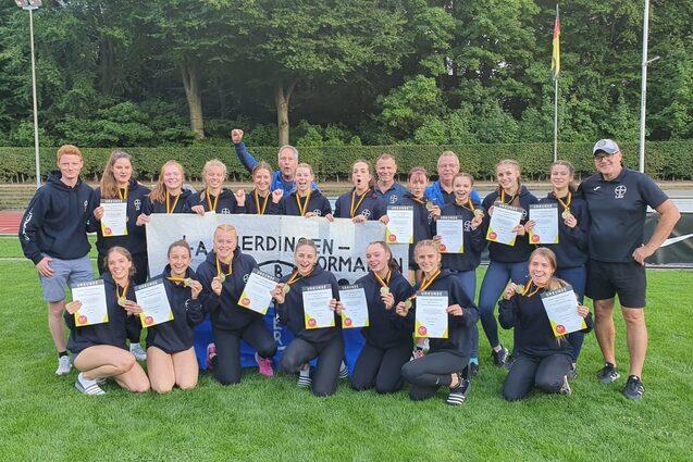 Die weibliche Jugend U20 der LAV Bayer Uerdingen/Dormagen ist Deutscher Meister im Team-Wettbewerb! Mit 13.067 Punkten setzten sich die Mädchen in zwölf Wettbewerben, die bei der Team-DM absolviert werden müssen, souverän durch. Die zweitplatzierte Mannschaft von der Eintracht Frankfurt lag mit 12.717 Zählern satte 350 Punkte dahinter. Im Vergleich zum Vorkampf (12.582 p) wurde in Hamburg das stärkste Team aufgestellt, abgesehen von zwei Krankheitsfällen, so dass am Ende des Wettkampftages ein nie gefährdeter Sieg dabei heraus sprang. Aus Uerdingen waren Anna Keyserlingk, Tessa Srumf, Hannah Odendahl, Maja Bertling, Finja Stupp und Carolin Molderings die „Punktelieferantinnen“. Anna, WM-Fünfte im Dreisprung, konnte in ihrer Spezialdisziplin nicht antreten, da der Dreisprung bei der Team-DM nicht im Programm ist. Sie zeigte allerdings in den anderen Sprungwettbewerben ebenfalls ihre Klasse und gewann den Weitsprung mit 6,04 m sowie den Hochsprung mit 1,69 m. Über 100 m sprintete die Hülserin zudem in 12,52 s die drittbeste Zeit. Tessa siegte in ihrer Spezialdisziplin 400 m unangefochten in 56,41 s und punktete ebenso im Weitsprung mit 5,29 m. Hannah gewann ihre Paradestrecke, die 800 m, in 2:12,96 min und trat ebenso auf der für sie ungewohnten längeren Distanz über 3000 m an, wo sie als Zweite in 10:47,50 min auch zu überzeugen wusste. Maja kam im Stabhochsprung mit 3,20 m (2.), Finja über 100 m in 12,76 s (6.) und Carolin im Diskuswurf mit 35,30 m (4.) in die Wertung. In der abschließenden 4 x 100 m Staffel sammelten Maja, Anna, Finja und Tessa in 48,14 s als Zweitschnellste noch einmal viele Punkte für’s Team.