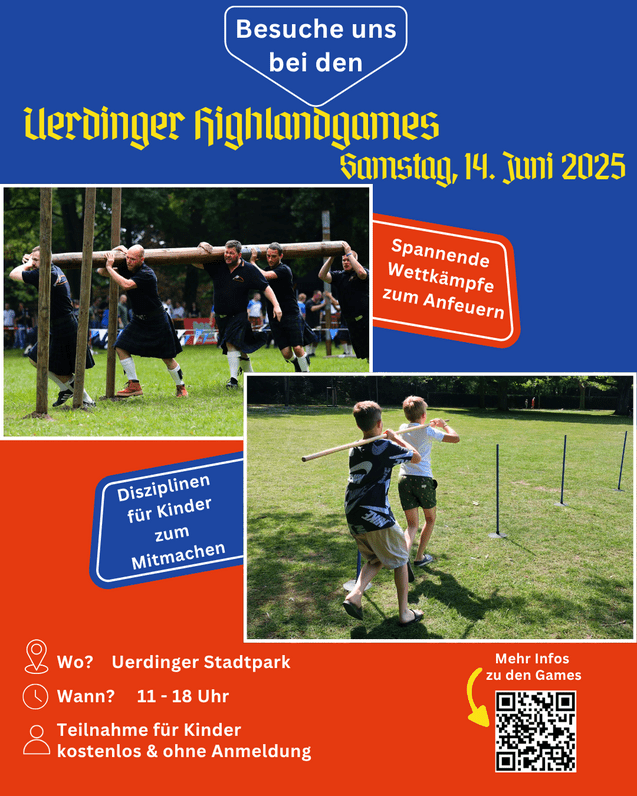 Am Samstag, den 14. Juni finden im Uerdinger Stadtpark die Highlandgames statt. Im Mittelpunkt stehen dabei die traditionellen Wettkämpfe für Erwachsene in Disziplinen wie Baumstammwerfen, Steinstoßen und Tauziehen. Zuschauer*innen sind herzlich eingeladen, das Geschehen mitzuverfolgen und die Teilnehmenden anzufeuern.